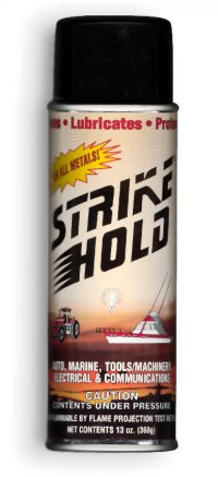 Strike-Hold® is a fast acting penetrant that immediately cuts through dirt, rust, carbon, and scale to quickly get into metal parts that have become frozen by or encrusted with corrosion and oxidation. This product provides a long-lasting dry lubricant, which reduces friction and will not build up or become brittle. As a demoisturant, Strike-Hold® helps dry out wet electrical gears and other water sensitive parts. As a protectant, this product provides a shield-like film against the effects of moisture and corrosion, even against salt water, while actually REPELLING SAND, DIRT AND DUST. Strike-Hold® contains no CFCs or other ozone depleting substances. Strike-Hold® is non-flammable and very safe to use as directed.